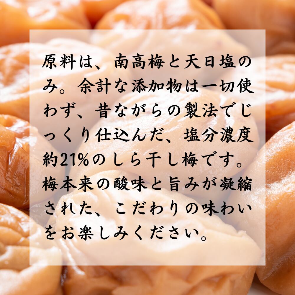 和歌山県みなべ町の自家農園で育てた紀州南高梅を使用した、手づくりの梅干し(しら干し)です。