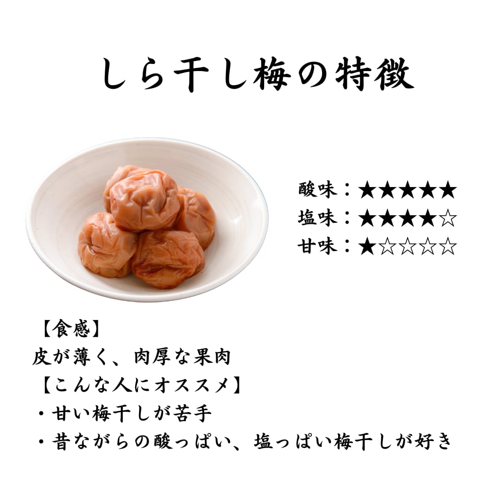 和歌山県産の最高級品種「南高梅」を使用し、伝統的な製法でじっくり仕上げた、無添加の本格梅干しです。梅と天日塩のみを使用し、余計な添加物を一切加えず、素材本来の風味を大切にしました。